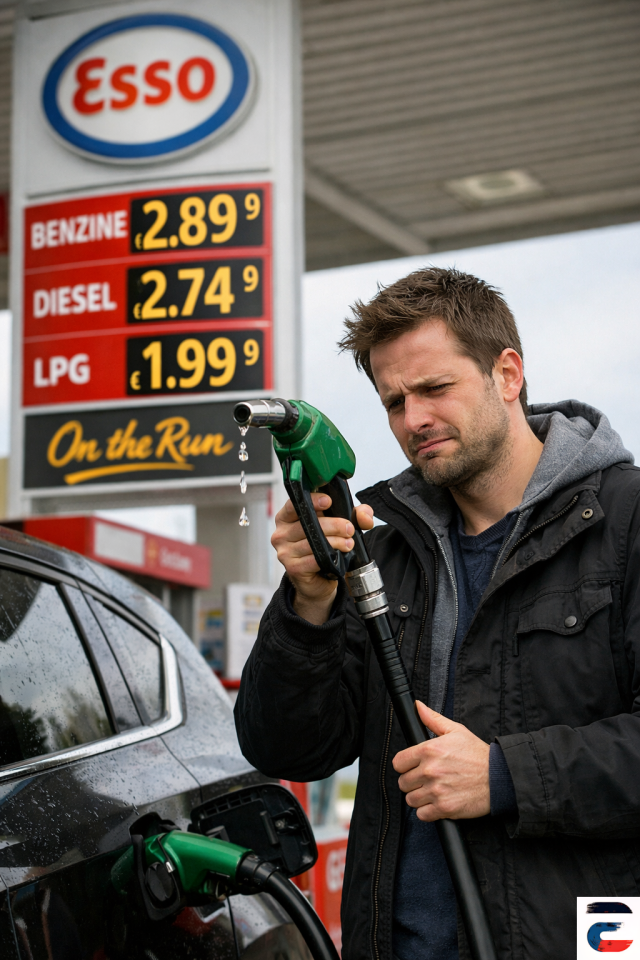 "€2,89 per liter?! Dat is geen benzine meer, dat is vloeibaar goud!" mompelt hij.