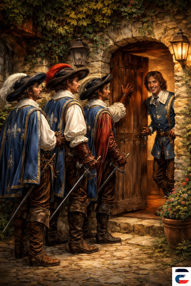 Ergens op een stoffige weg, tussen twee twijfelachtige herbergen en een bijzonder koppige ezel, liepen drie vermoeide maar vastberaden musketiers: Athos, Porthos en Aramis.