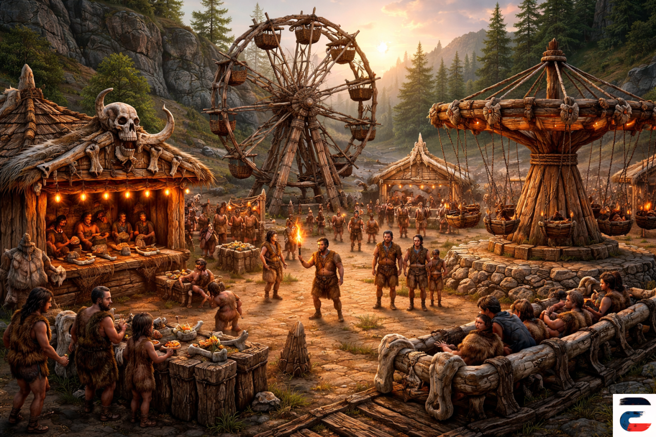 Lang, lang geleden… nog vóór iemand wist wat "korting" betekende en "wachtrij" gewoon "achter die mammoet gaan staan" was… werd de allereerste kermis uitgevonden.