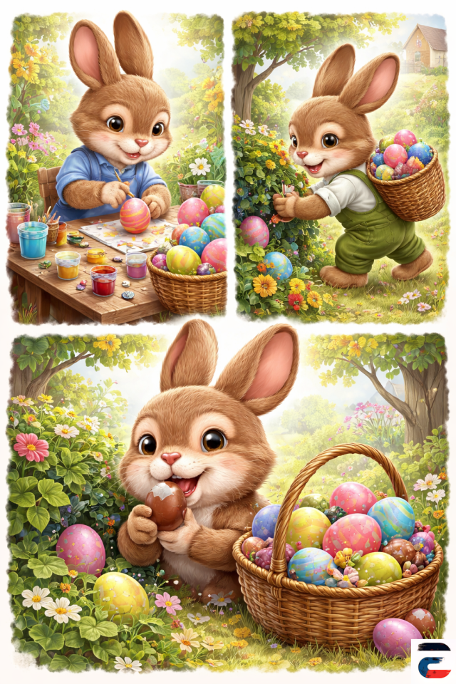 Op een zonnige lentedag, toen de bloemen voorzichtig hun kopjes boven het gras uitstaken, waren drie paashazen druk in de weer met hun jaarlijkse, oh zo belangrijke taak.