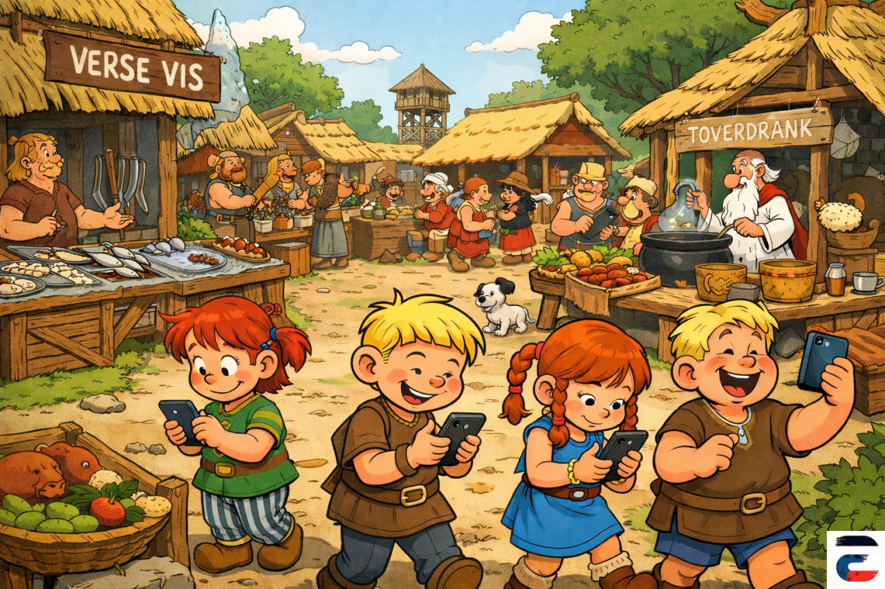 Waar ze vroeger met houten zwaarden rondrenden, zaten ze nu op boomstronken, allemaal gebogen over een klein, glimmend rechthoekig voorwerp: de gsm.
