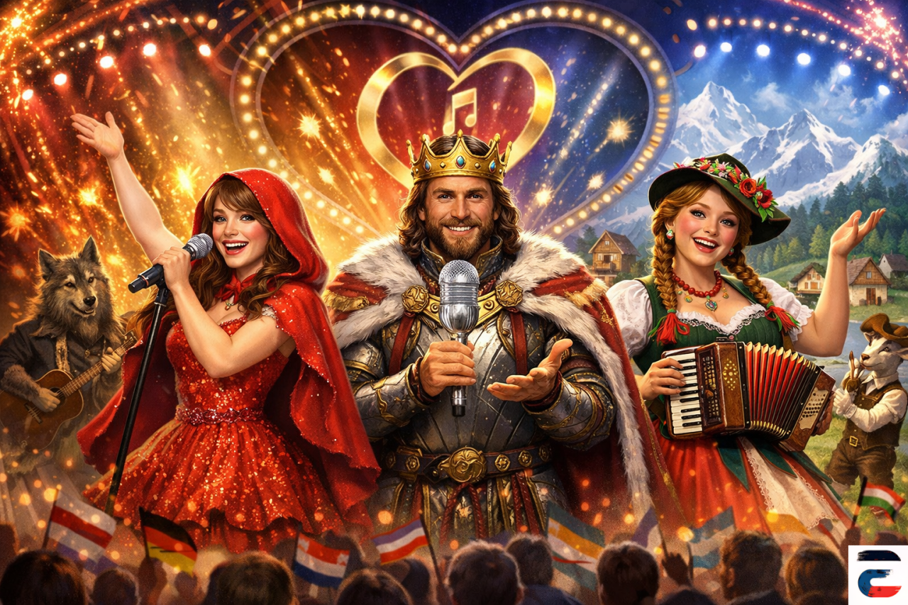 "Welkom bij het Sprookjes-Songfestival! Wie wint, krijgt een gouden zwaard… dat eigenlijk een microfoon is, maar marketing vond dit cooler klinken."